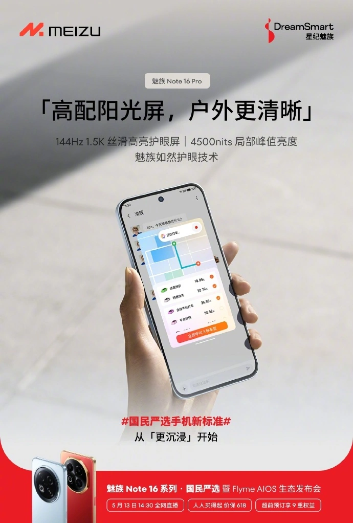 据IT之家昨日报道,魅族 Note16 Pro 搭载 144Hz 1.5K 高亮护眼屏,4500 nits 的局部峰值亮度,旗舰同款如然护眼技术。魅族 Note 16 搭载 120Hz 1080P 高素质 LCD 直屏,1050nit 超高亮度,通过泰尔低风险舒适度护眼认证。