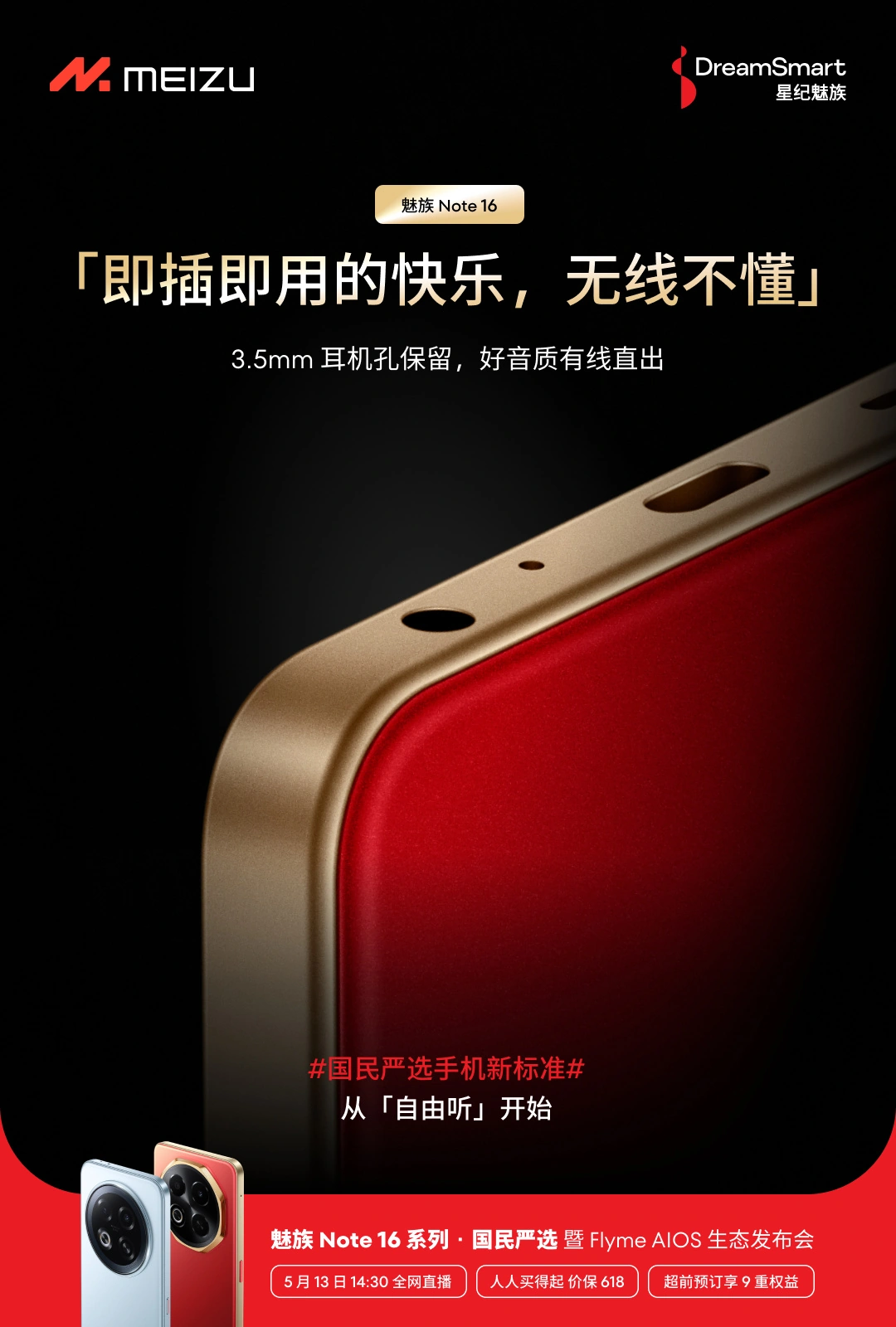 IT之家 5 月 11 日消息,星纪魅族科技官方今日发文透露了 Note 16 系列手机部分外围配置:魅族 Note 16 Pro 搭载全功能 NFC、红外遥控;魅族 Note 16 标准版保留 3.5mm 耳机孔,支持即插即用。