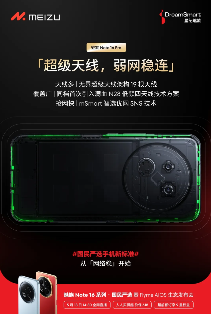 据介绍,魅族 Note 16 Pro 是行业首款通过中国信通院-通信信号能力卓越五星测评手机,搭载无界超级天线系统,配备 19 根超级天线,同档首次引入满血 N28 低频四天线技术方案,实现更广信号覆盖。