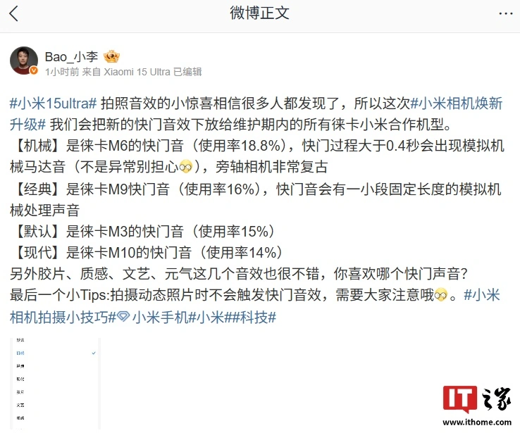 据IT之家此前报道,小米相机部的产品经理 @Bao_小李 本月发文称:“小米 15 Ultra 拍照音效的小惊喜相信很多人都发现了,所以这次小米相机焕新升级我们会把新的快门音效下放给维护期内的所有徕卡小米合作机型。”