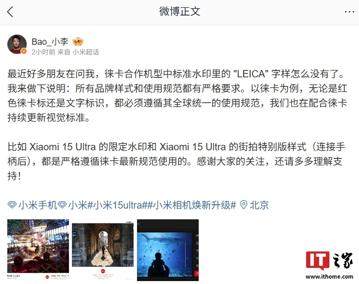 IT之家 5 月 12 日消息,小米相机部的产品经理 @Bao_小李 今日发文,对徕卡合作机型中标准水印里的 “LEICA” 字样消失问题进行了说明。原文如下: