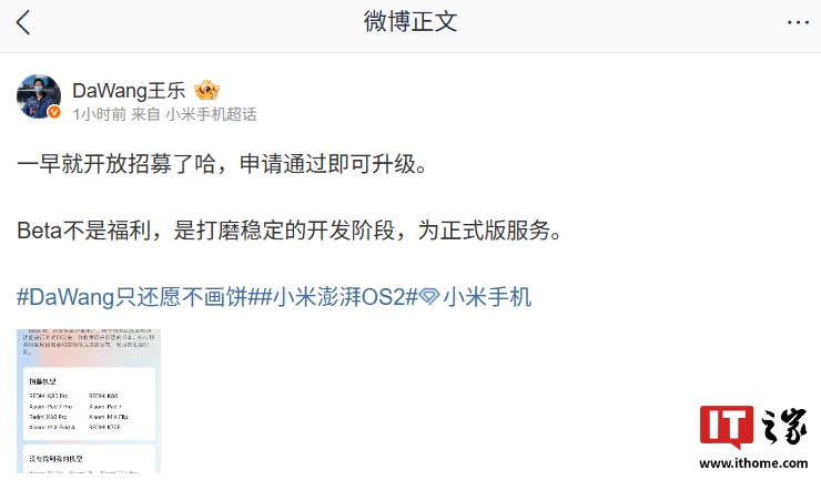 小米公司应用软件部总监王乐今日也发文表示,用户申请通过即可升级,但 Beta 不是福利,是打磨稳定的开发阶段,为正式版服务。
