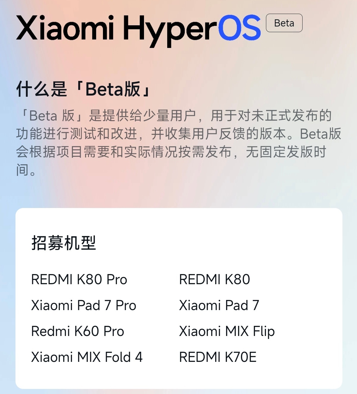 IT之家 5 月 12 日消息,小米 REDMI K80 / K80 Pro、Pad 7 / 7 Pro、MIX Fold 4 等机型今日开启澎湃 HyperOS Beta 版内测招募。具体机型如下: