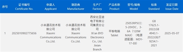快科技5月12日消息,据3C认证官网显示,小米一款神秘新平板已经获得认证,型号为“25053RP5CC”,最高支持120W快充。