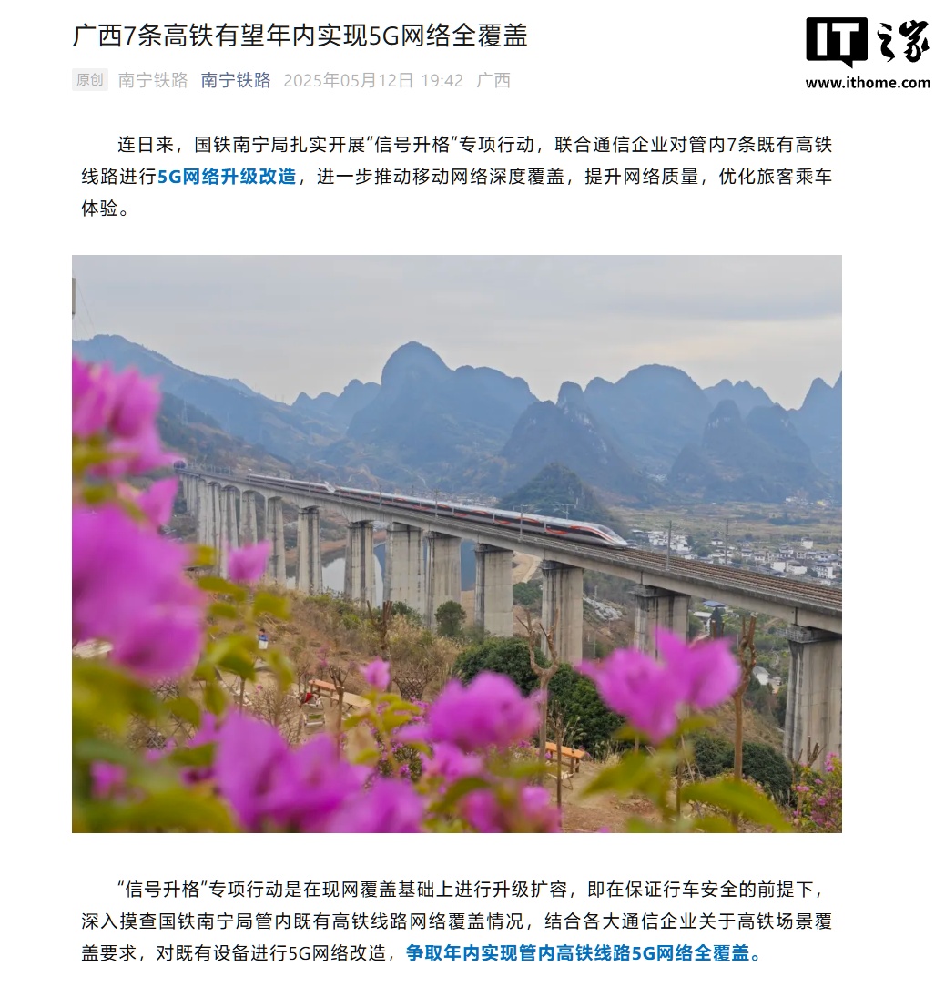 文章来源于互联网:IT之家-国铁南宁局开展“信号升格”行动,广西 7 条高铁年内有望实现 5G 网络全覆盖