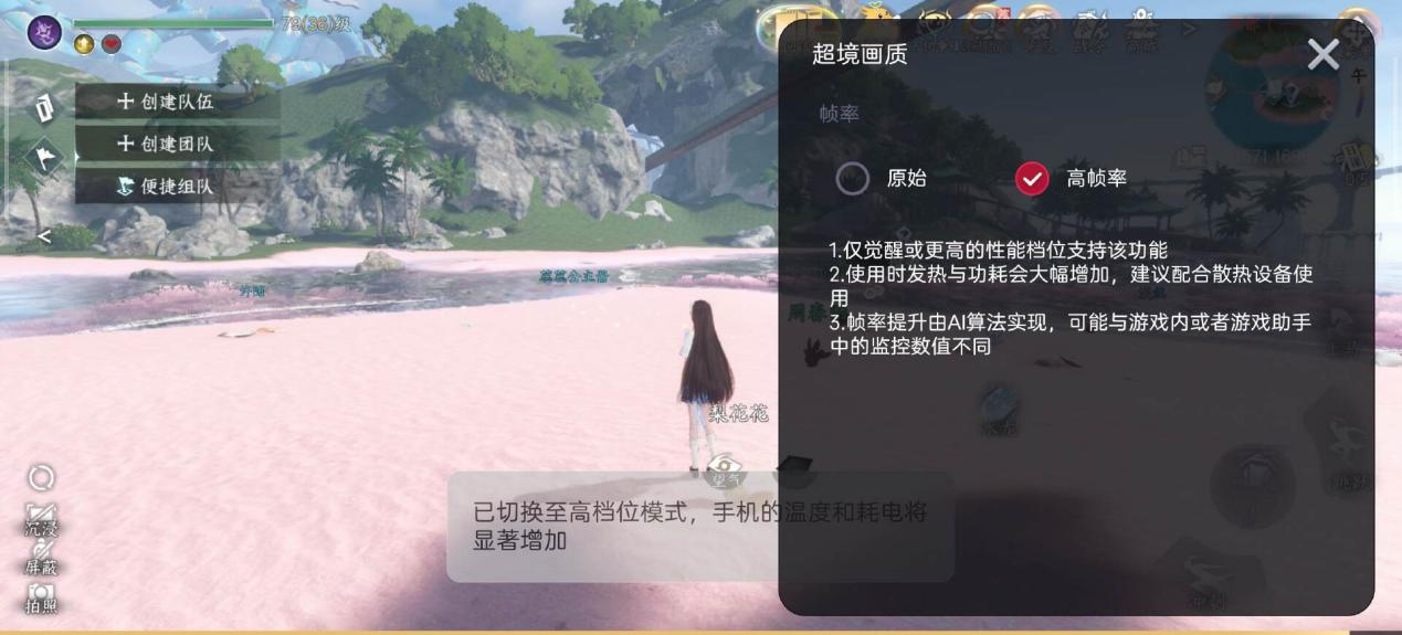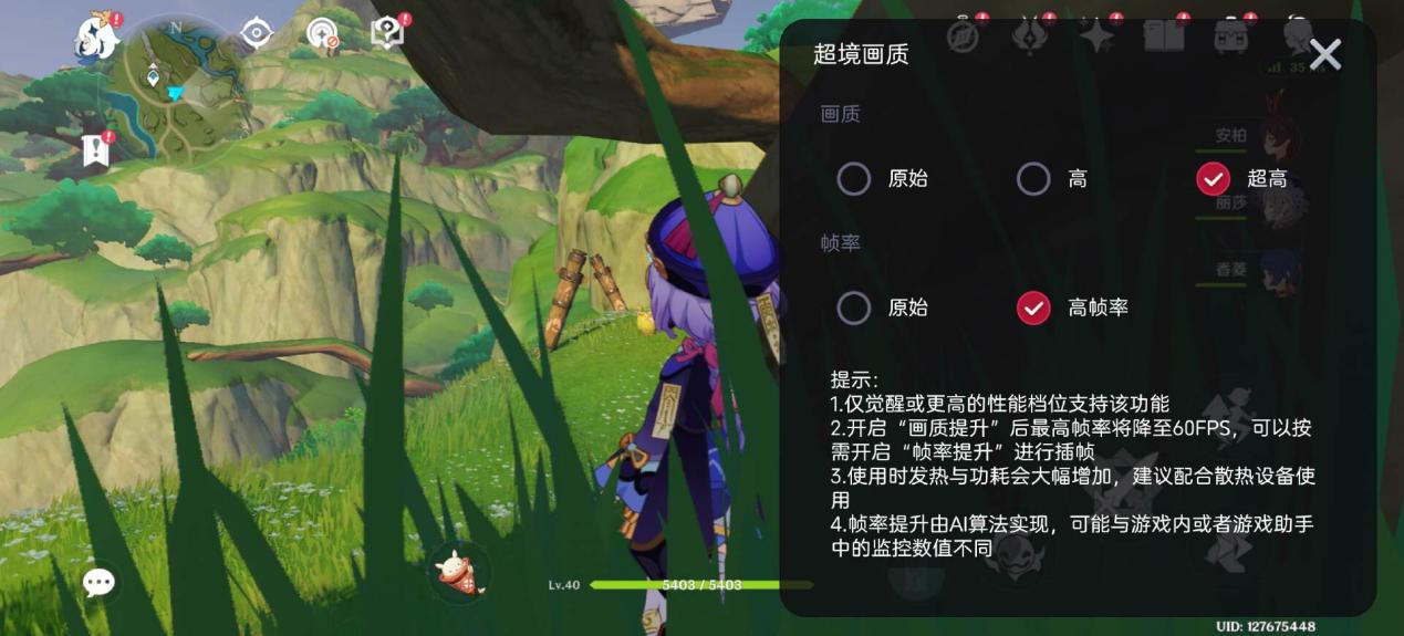 以《原神》为例,该模式下可以选择极高画质和极高帧率的同开 ——《原神》原生的 60 帧画质直接飙升到 120 帧。