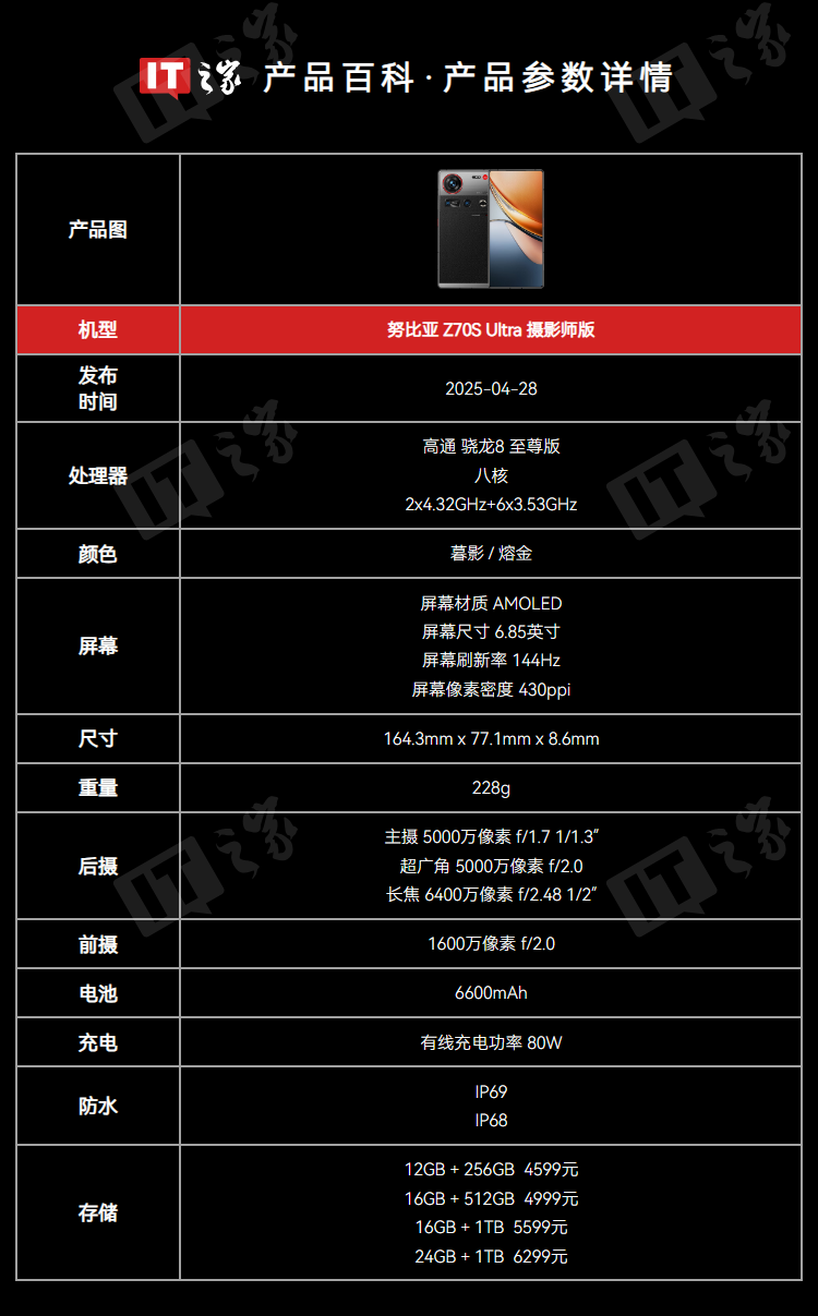 努比亚 Z70S Ultra 摄影师版重量为 228g,厚度为 8.6mm,支持 IP68 / IP69 防尘防水。