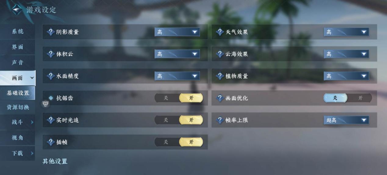 如图所示,选择最高画质,开启实时光追和抗锯齿,同时帧率选择超高,场景选择澜都跑图,也是满帧表现。