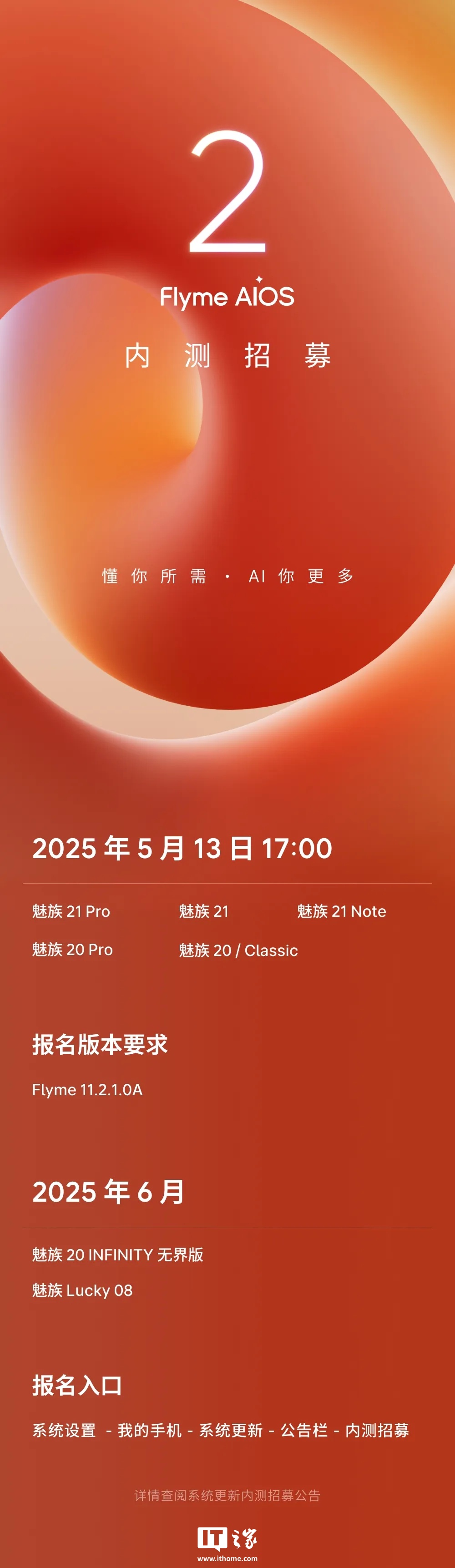 IT之家注意到,星纪魅族社区官方账号 @Flyme 今日宣布,Flyme AIOS 2 内测通道今天 17:00 开启,魅族 21、21 PRO、21 Note、20/20 Classic、20 Pro 用户可报名尝鲜。经实测,报名通过后即可收到内测版本更新。相关说明如下: