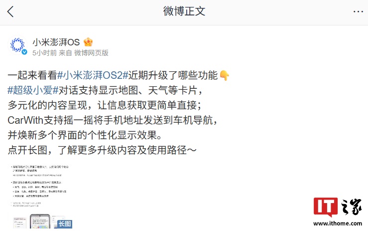 IT之家 5 月 13 日消息,小米澎湃 OS 官方微博今日发布《小米澎湃 OS 2 近期升级功能一览》。新版本超级小爱对话支持显示地图、天气等卡片,同时 CarWith 支持摇一摇将手机地址发送到车机导航。