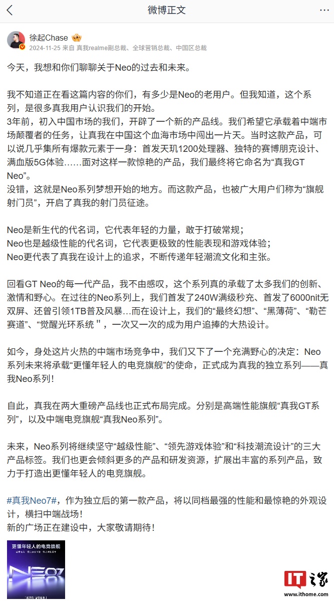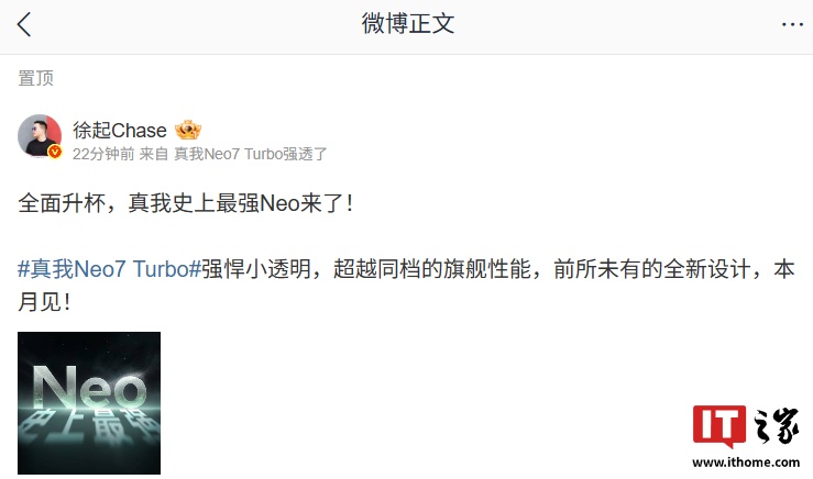 文章来源于互联网:IT之家-realme 真我 Neo7 Turbo 手机官宣本月见,号称系列“史上最强”