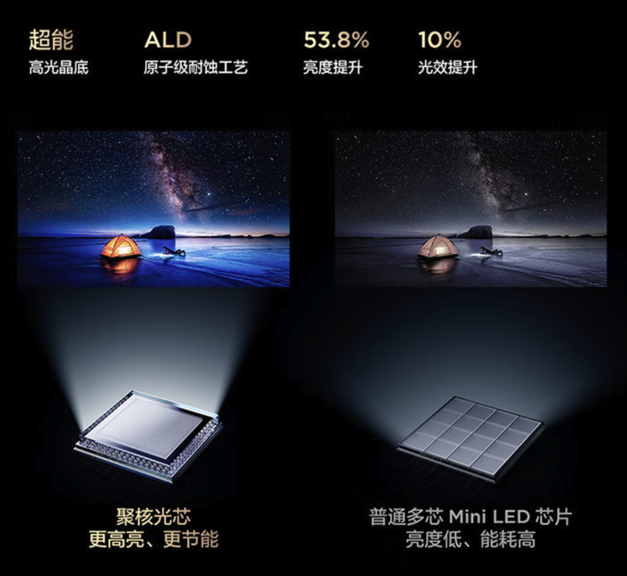 就拿发光芯片举例吧!在 TCL T7L Pro 上,超能高光晶底采用 ALD 原子级耐蚀工艺,大幅提升电视的亮度与能效。相比行业普通多芯 Mini LED 芯片,亮度提升 50%+,光效提升 10%。