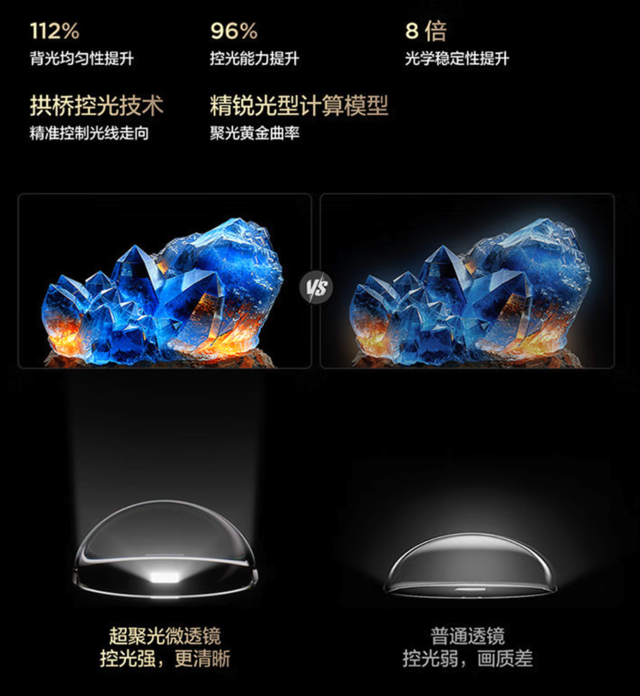 具体来说,万象分区是一套系统级光学解决方案,从 Mini LED 发光芯片、透镜技术,到 OD 混光距离、光影控制算法以及屏幕等多个关键维度,全面优化 Mini LED 电视的光学表现。