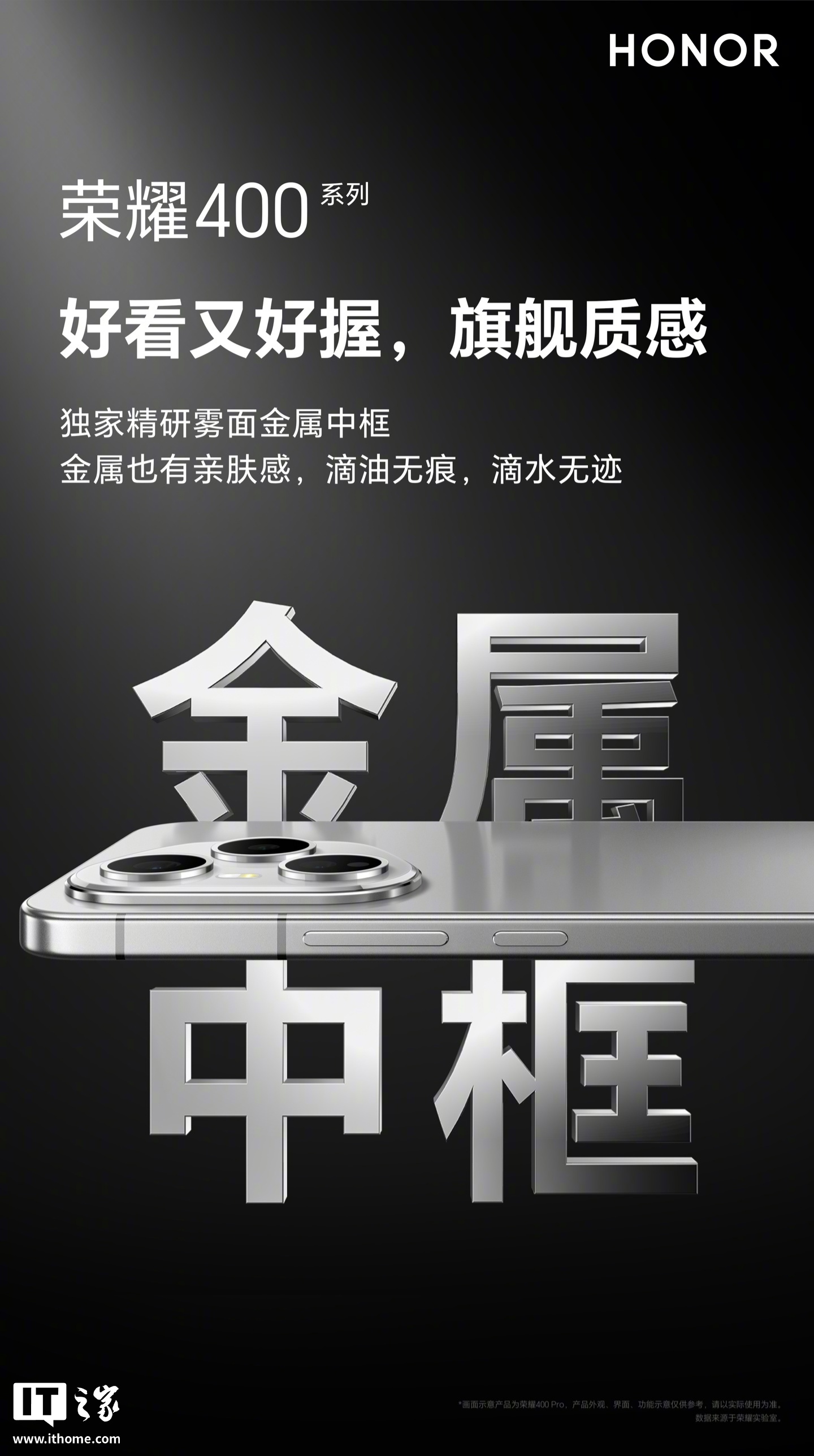 文章来源于互联网:IT之家-荣耀 400 系列手机预热:直屏 + 全系金属中框设计、独家精研雾面工艺
