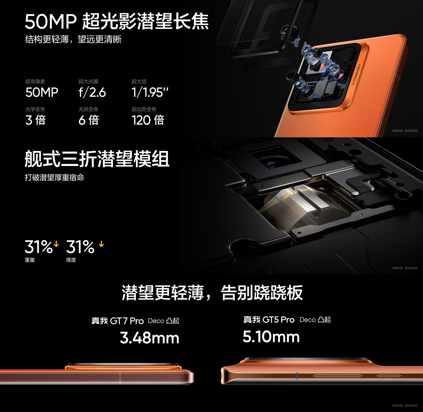 影像方面,realme 真我 GT7 Pro 手机配备全新 5000 万超光影潜望长焦(1/1.95″),支持 AI 长焦超分、6 倍无损变焦、最大 120 倍变焦。新机还后置 5000 万 1/1.56″ 主摄 + 8MP 超广角,提供贾樟柯式电影滤镜、迅驰闪拍模,支持拍摄“超清 Live 图”、杜比视界 HDR 视频。