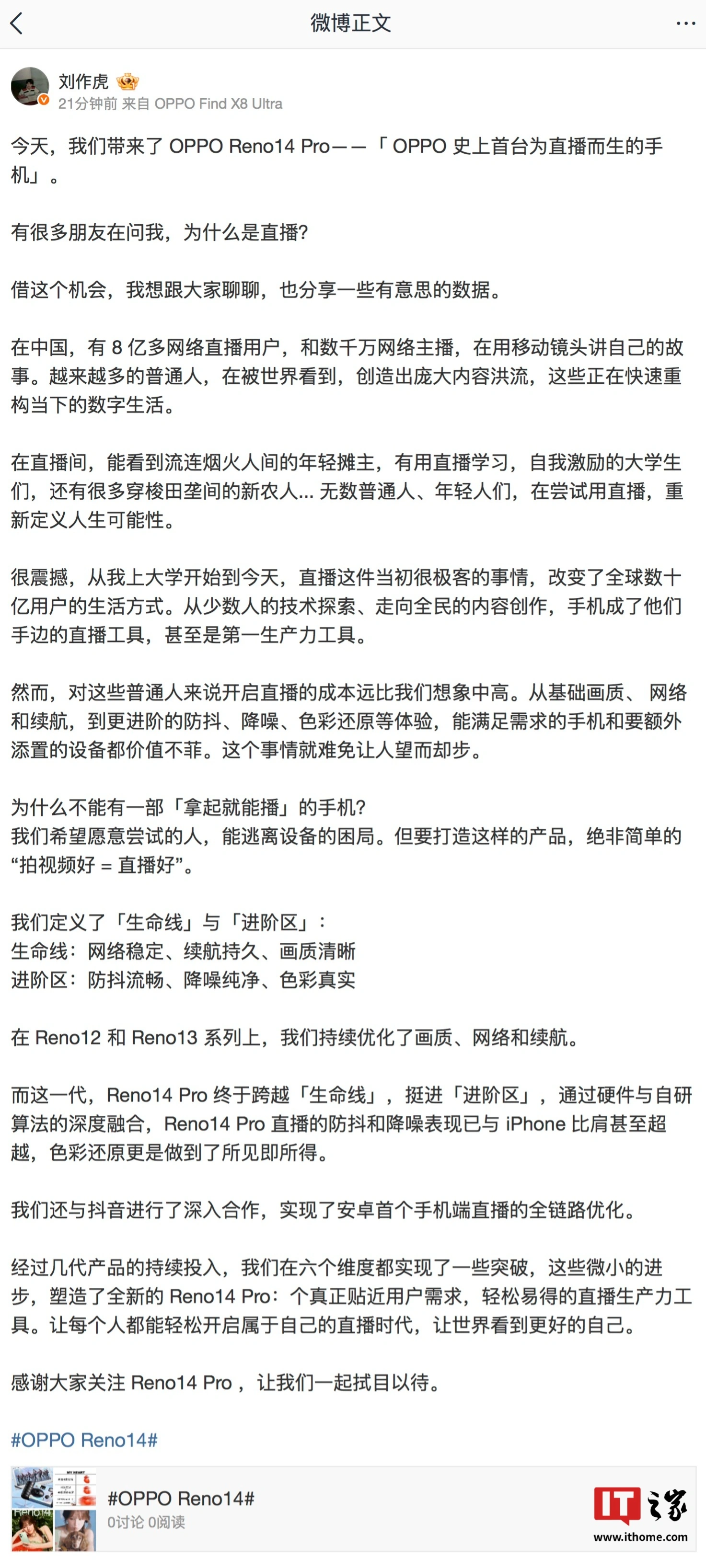 IT之家 5 月 14 日消息,OPPO 首席产品官、一加创始人刘作虎今日发布长文,介绍了明日将发布的 OPPO Reno 14 Pro 手机,新机号称「OPPO 史上首台为直播而生的手机」。