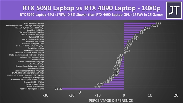 RTX 5090移动版就是笑话!4K仅比RTX 4090快3%、1080p/1440p原地踏步