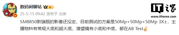 文章来源于互联网:IT之家-消息称某厂 SM8850 新旗舰测试 50Mp 三摄方案,预计为一加 15
