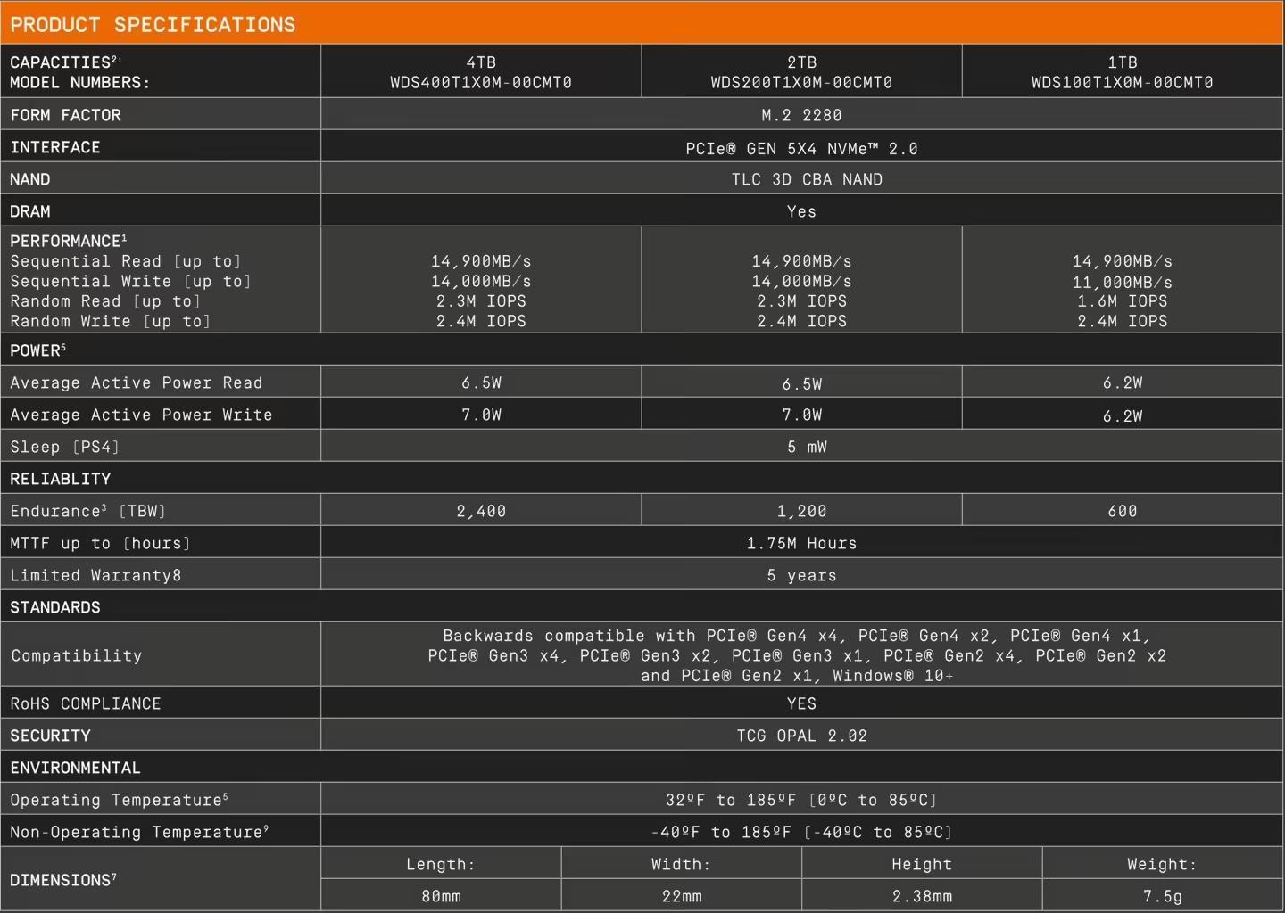 WD_BLACK 8100 首发包含 1TB、2TB、4TB 三个容量版本,今年晚些时候 8TB 版本也将到来,现有版本性能、耐久参数如下:
