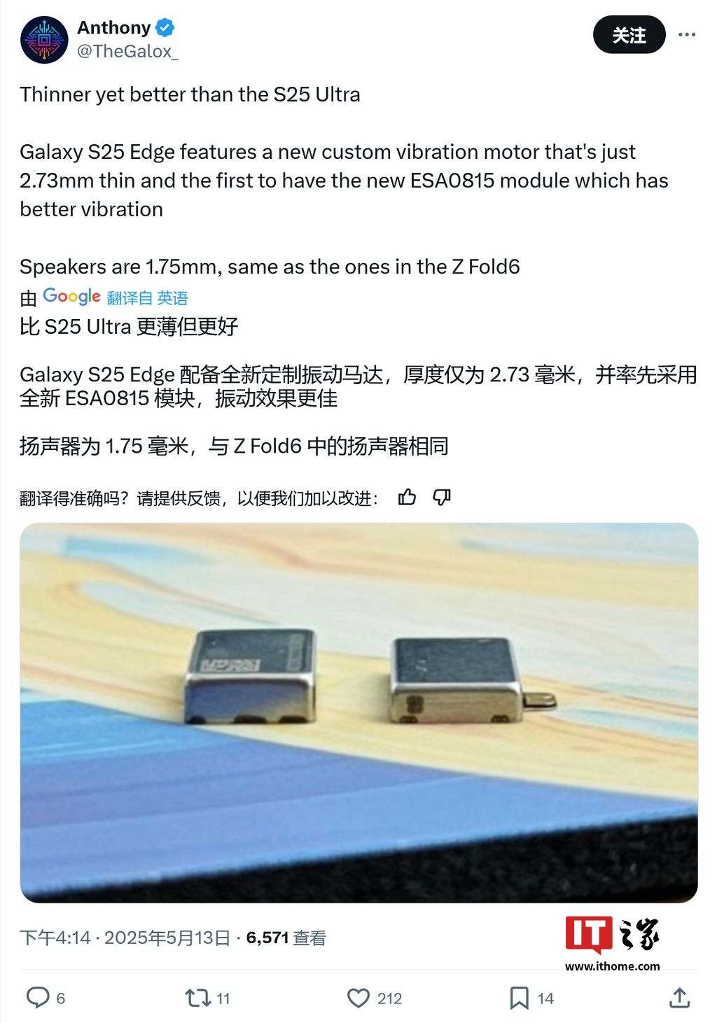 IT之家 5 月 15 日消息,消息源 @TheGalox_ 于 5 月 13 日在 X 平台发布推文,表示三星为其最薄旗舰 Galaxy S25 Edge 手机,定制打造厚度仅 2.73mm 的新型振动马达,但效果比 Galaxy S25 Ultra 更为优秀。