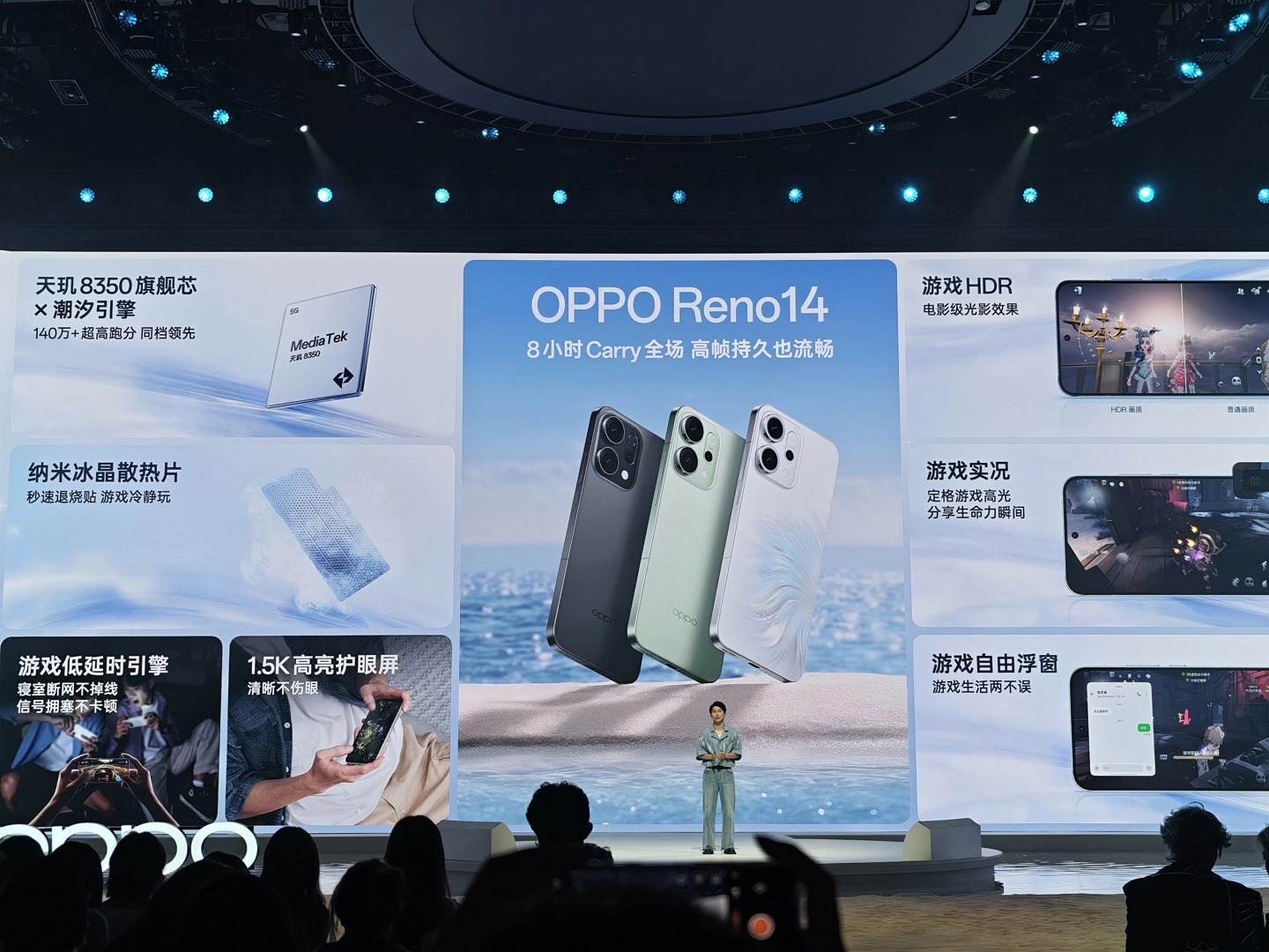 OPPO Reno14 搭载全新纳米冰晶散热片,采用纳米流体强化传热技术,相比于 iPhone 的石墨散热片,导热效率提升 3 倍,官方宣称“相当于给手机贴上一块秒速退烧贴”。OPPO 与天玑联合进行芯片级优化,推出游戏低时延引擎,抢网更快、弱网也流畅。宿舍 0 点断网,毫秒之间从 WiFi 切到 5GP。