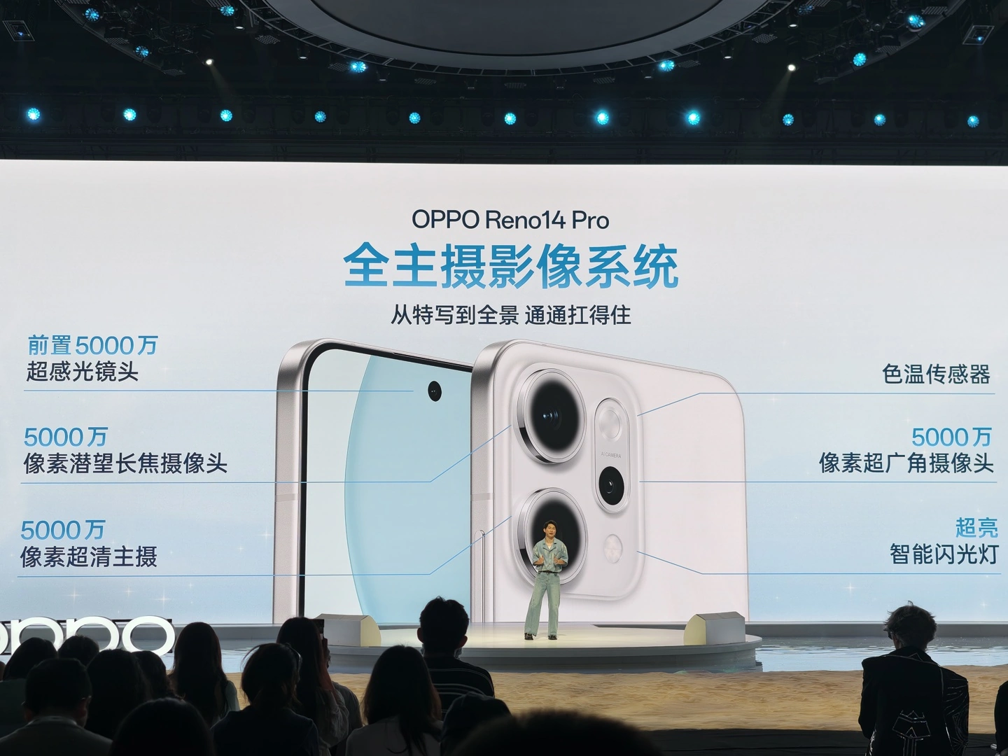 影像方面,OPPO Reno14 Pro 首次带来了 50MP 潜望长焦,以及 50MP 超广角、50MP 主摄、50MP 前置镜头。