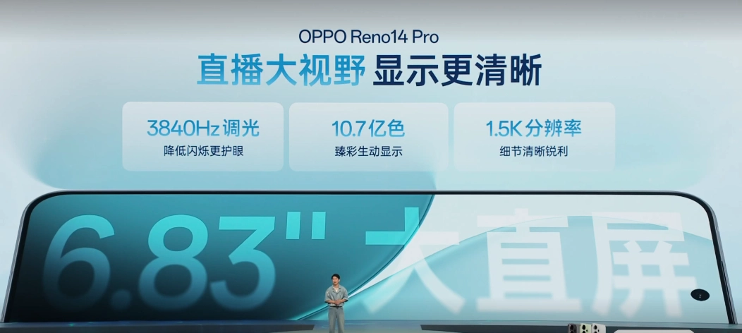 OPPO Reno14 Pro 支持专业级防抖、智能降噪、超清画质、色彩高还原,号称是“一站式直播神器”。