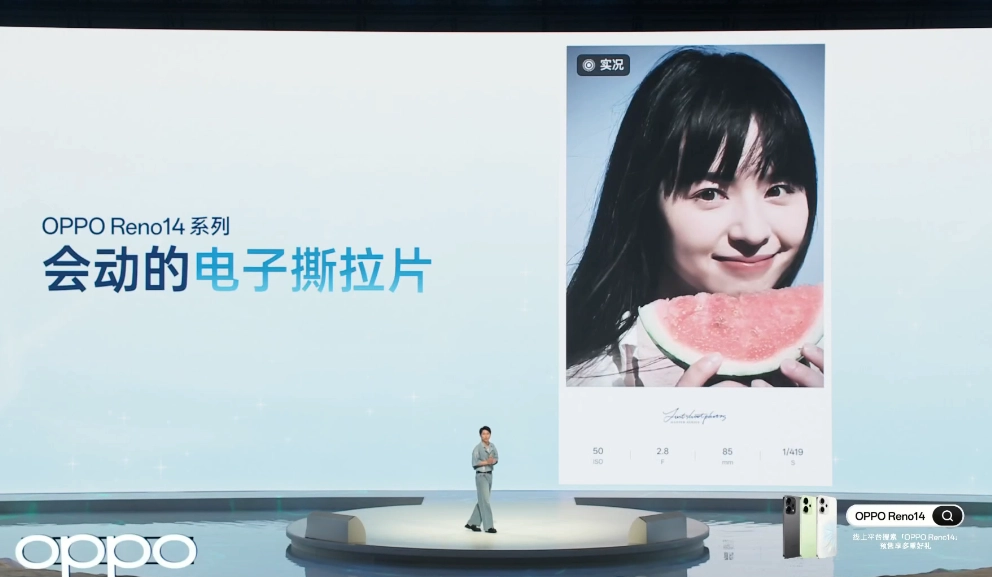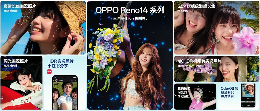新机全新升级“超亮智能闪光灯”,新增爆闪模式,打闪亮度提升 100%,支持闪光实况照片;全系配置 3.5 倍潜望长焦镜头,支持高清长焦实况照片。此外,OPPO Reno14 系列实况照片还可叠加复古(NC 胶片)/清新(CC 胶片)/通透(NH 胶片)三款滤镜。