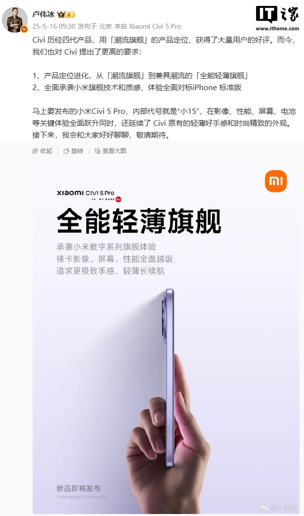 IT之家 5 月 16 日消息,小米集团合伙人、总裁,手机部总裁,小米品牌总经理卢伟冰今日发文宣布 Civi 系列产品定位进化,从“潮流旗舰”到兼具潮流的“全能轻薄旗舰”。全面承袭小米旗舰技术和质感,体验全面对标 iPhone 标准版。