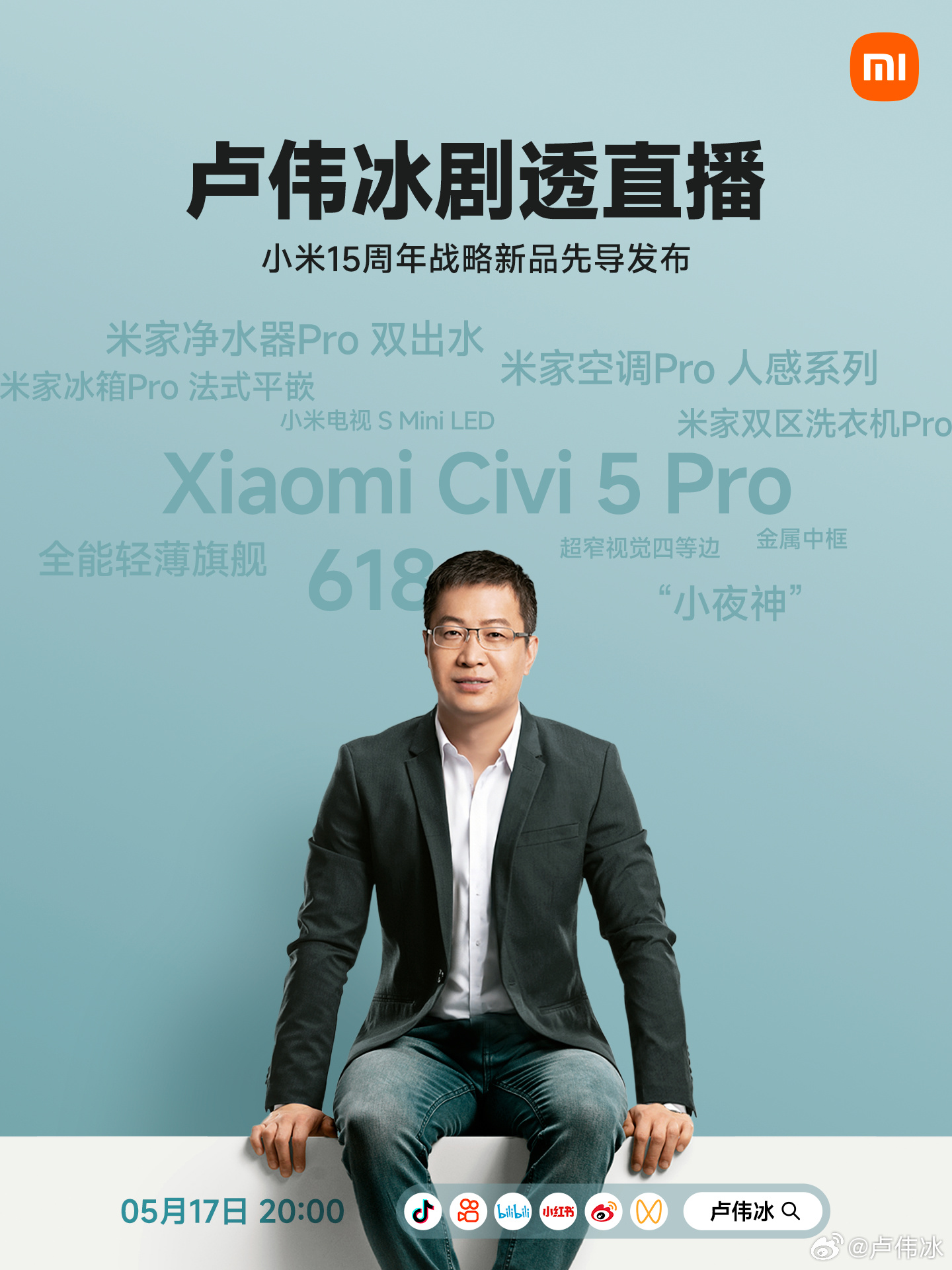 文章来源于互联网:IT之家-卢伟冰明晚开播:与许斐、王腾、魏思琪一同聊聊小米 Civi 5 Pro 和 AIoT 众多新品