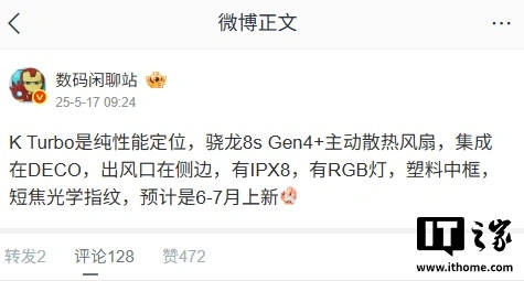 文章来源于互联网:IT之家-OPPO K 系列 Turbo 新机首曝:高通骁龙 8s Gen4 + 主动散热风扇,预计 6-7 月发布