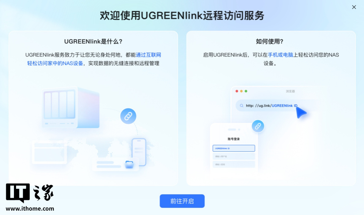 下载后打开,与绿联 NAS 私有云 DH4300 Plus 链接同一网络,并授予 App 内网访问权限后,就会自动搜索到设备了。激活过程中需要设置管理员账号和密码,设置后一定要记住哦。设置后,如果想要在家里之外的地方访问,还可以进一步绑定电话号码,开启 UGREENlink 远程访问服务。