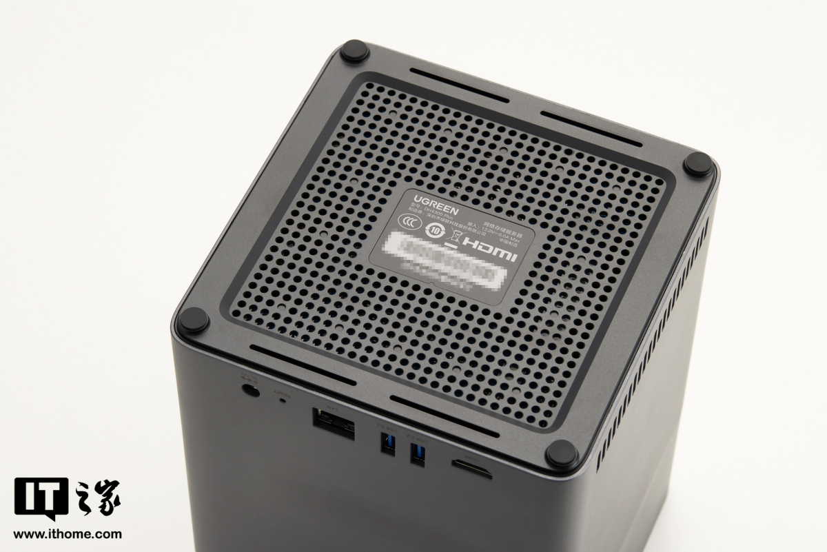 机身背面为 12V6A 电源接口、重置按键、2.5GbE 网口、2 个 USB 3.2 Gen 1 接口和 1 个 HDMI 接口。背面顶部为进风口。