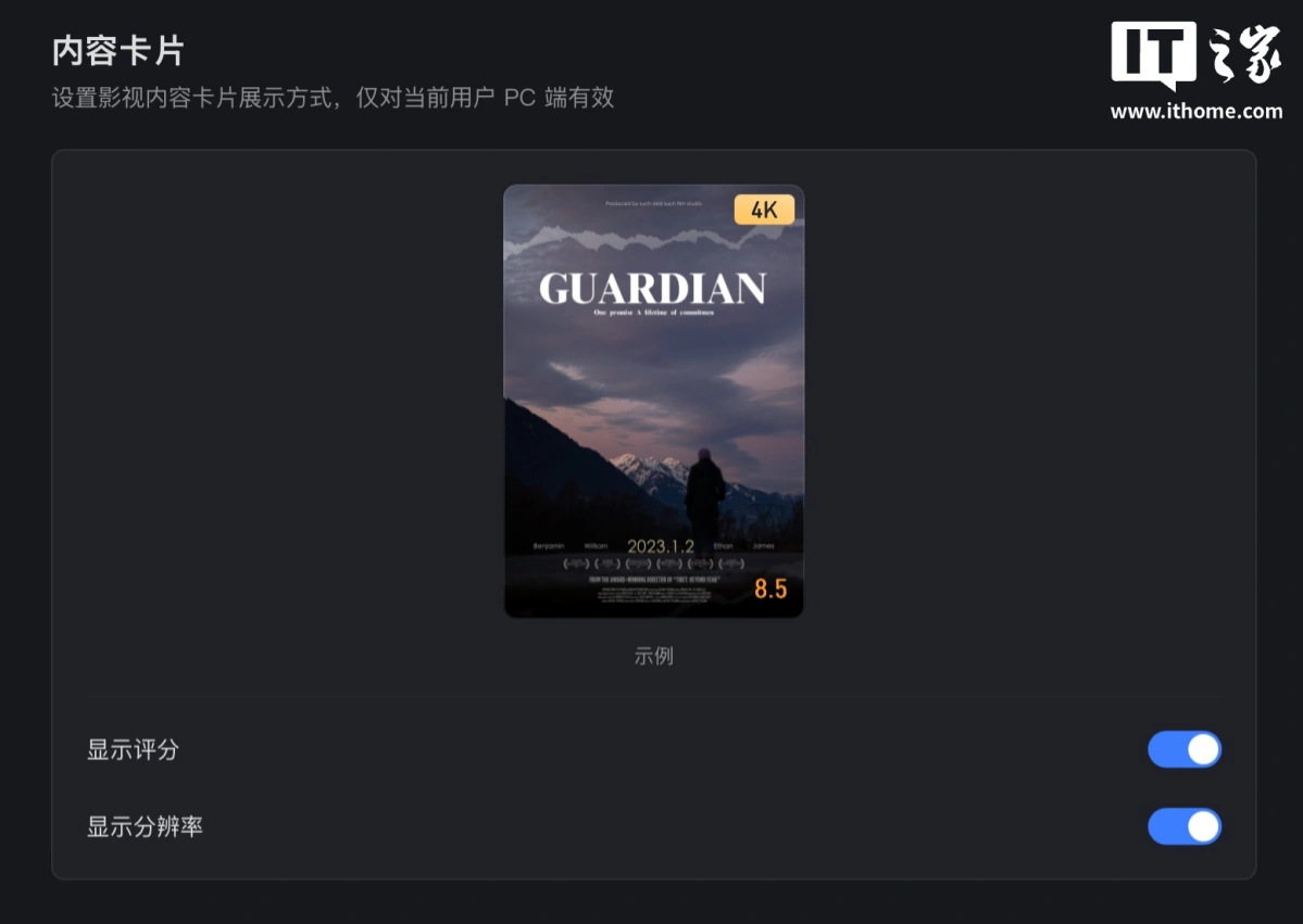 并且内容卡片右上角可以显示资源的分辨率,而右下角则可以显示电影的评分(TMDB 评分),这样在选择影片的时候,能够更加高效直观。