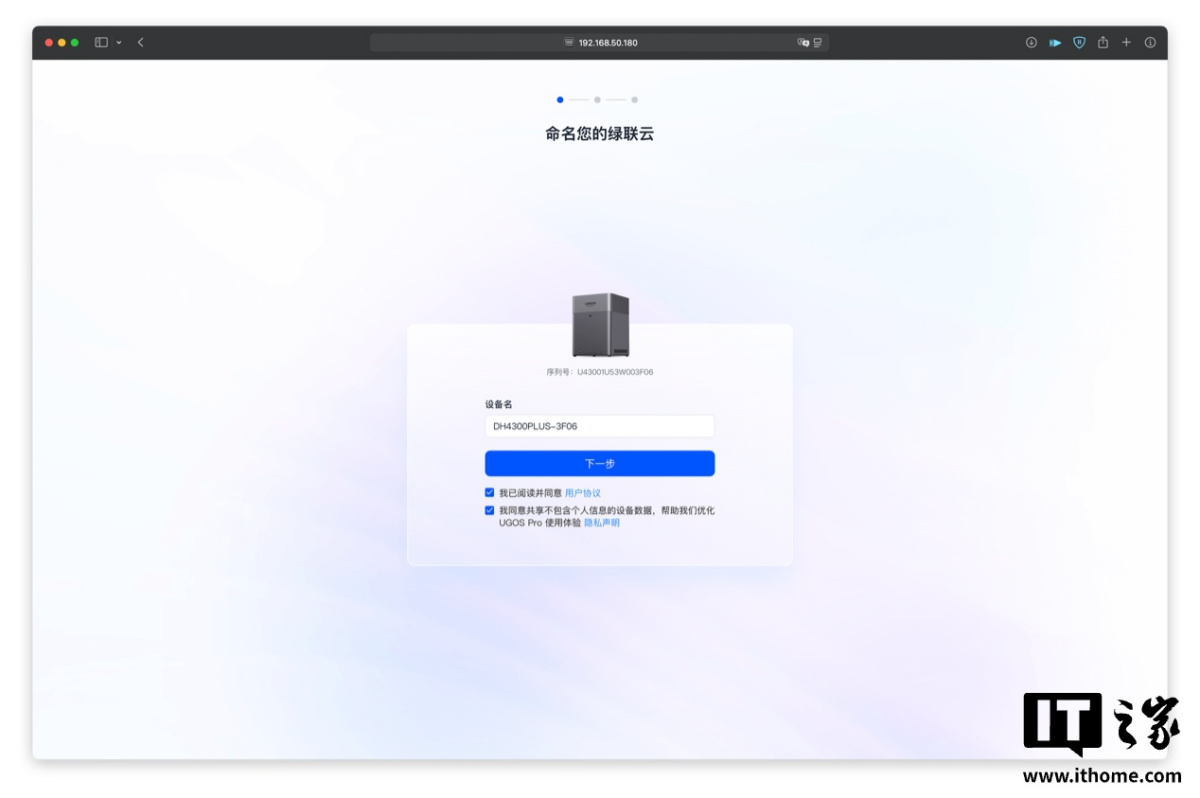 作为一款面向入门用户的设备,简单易用的上手体验还是很关键的。在这方面,绿联 NAS 私有云 DH4300 Plus 和其搭载的 UGOS Pro 系统带来的初次部署体验还是不错的。在使用包装附带的配件安装好硬盘后,就可以通电开机了。