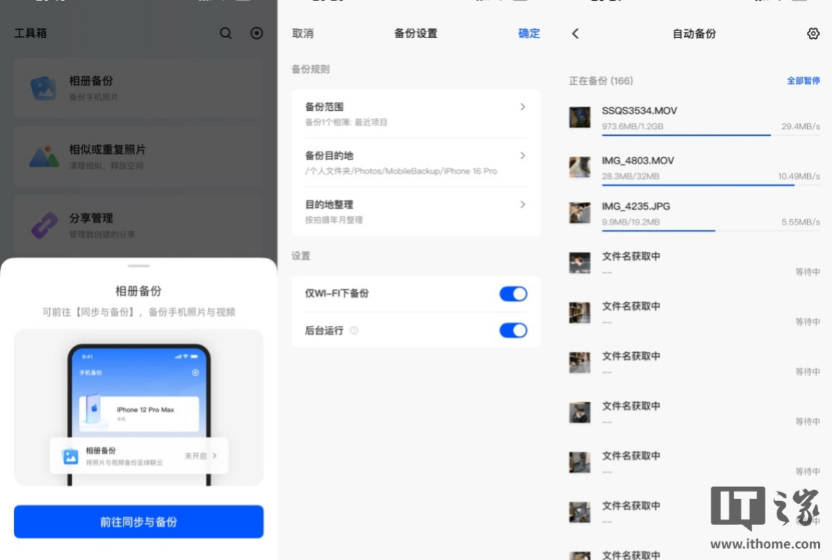 而对于手机中的照片,则可以开启相册自动备份,这样回到家链接 WiFi 后,就能自动进行相册的增量备份了。实测在 WiFi 下备份的速度还是非常快的,并且苹果 Livephotos 动态照片也是支持原格式保存的。