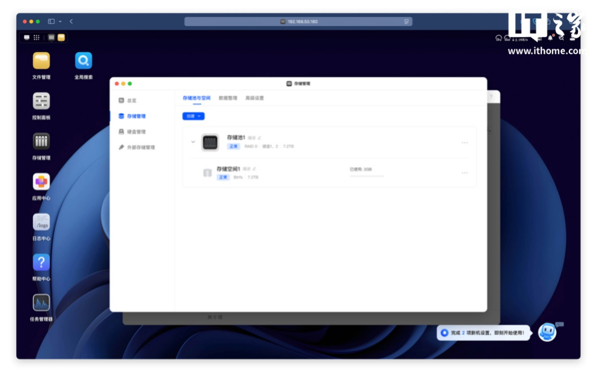 设置完成后,有新手引导,需要根据新手引导进行硬盘、存储空间的设置。这部分设置小编转到电脑上完成,这里小编安装了两块 4TB 的硬盘,RAID 方面,绿联 NAS 私有云 DH4300 Plus 支持 JBOD,Basic,RAID 0/1/5/6/10 等多种模式,这里就不对各种 RAID 模式详细展开了,只说对于普通用户能够用到的几种。