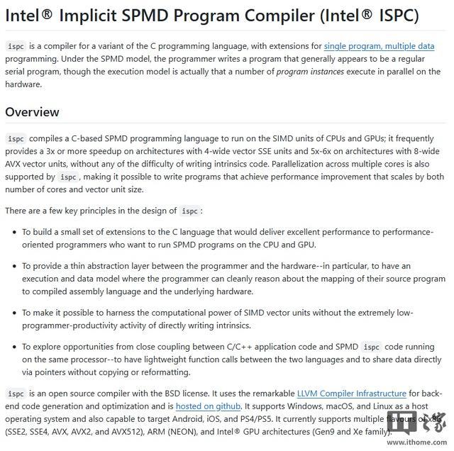 IT之家 5 月 17 日消息,英特尔昨天在 GitHub 上放出了最新的隐式 SPMD 程序编译器(ISPC)1.27 版本,支持英特尔高级矢量扩展 10.2,并对面向 SPMD 编程的 C 语言进行了功能优化。