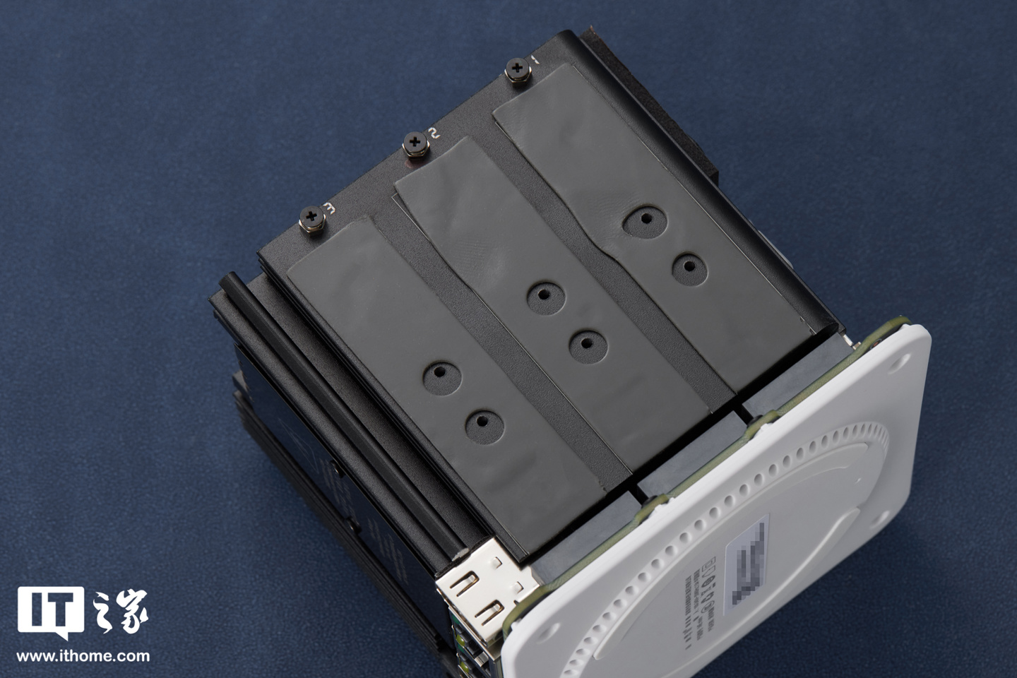 我们可以看到,其内部采用了模块化金属框架,包括主板 / 存储 / 散热三明治结构,六个 M.2 硬盘插槽(兼容 2230/2242/2280)位于机身两侧,默认预装了六个导热垫(导热垫未覆贴膜,NAND 闪存芯片应贴合内侧散热鳍片方向),且分别标注有 123、456,在细节方面做得非常不错。