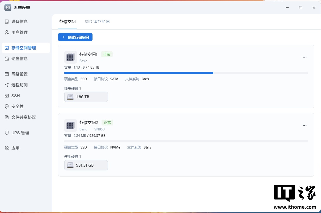 随后,我们可以通过系统设置中的“存储空间管理”功能创建存储池,支持多种模式和 RAID 选项,例如将单块硬盘拆分成多个存储空间,或者将多个硬盘合并创建为一个存储分区。