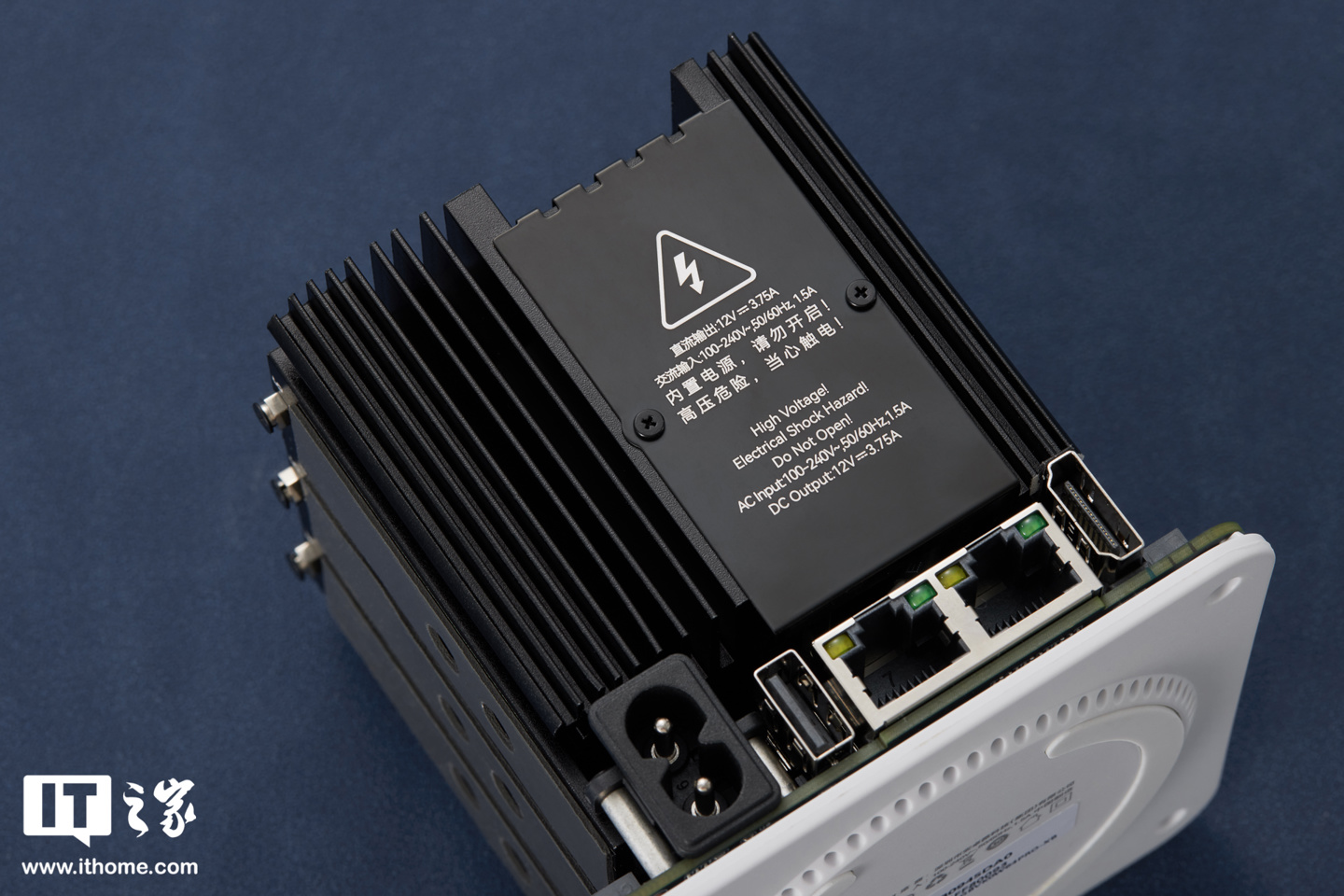 机身背面则是 45W(12V 3.75A)的内置电源。这一功率对于一款 N200(最大 15W)小主机来说已经十分宽裕,能够保证系统稳定运行,且实测温控表现也是相当不错的。