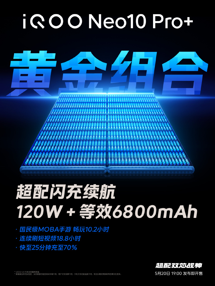 IT之家 5 月 19 日消息,iQOO Neo10 Pro+ 将于 5 月 20 日 19:00 发布即开售,今日最新预热显示这款新机搭载 6800mAh 电池、120W 快充,快至 25 分钟充至 70%。