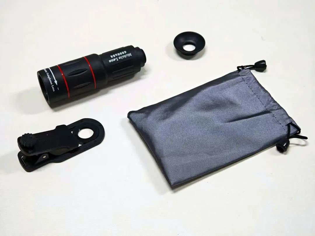 打开包装盒,里面的内容物出奇的简单,一个表面采用橡胶和塑料材质的廉价增距镜,一个负责把增距镜固定在手机上的简陋夹子,以及一个可以接在增距镜后面,让它变成望远镜的转接配件。