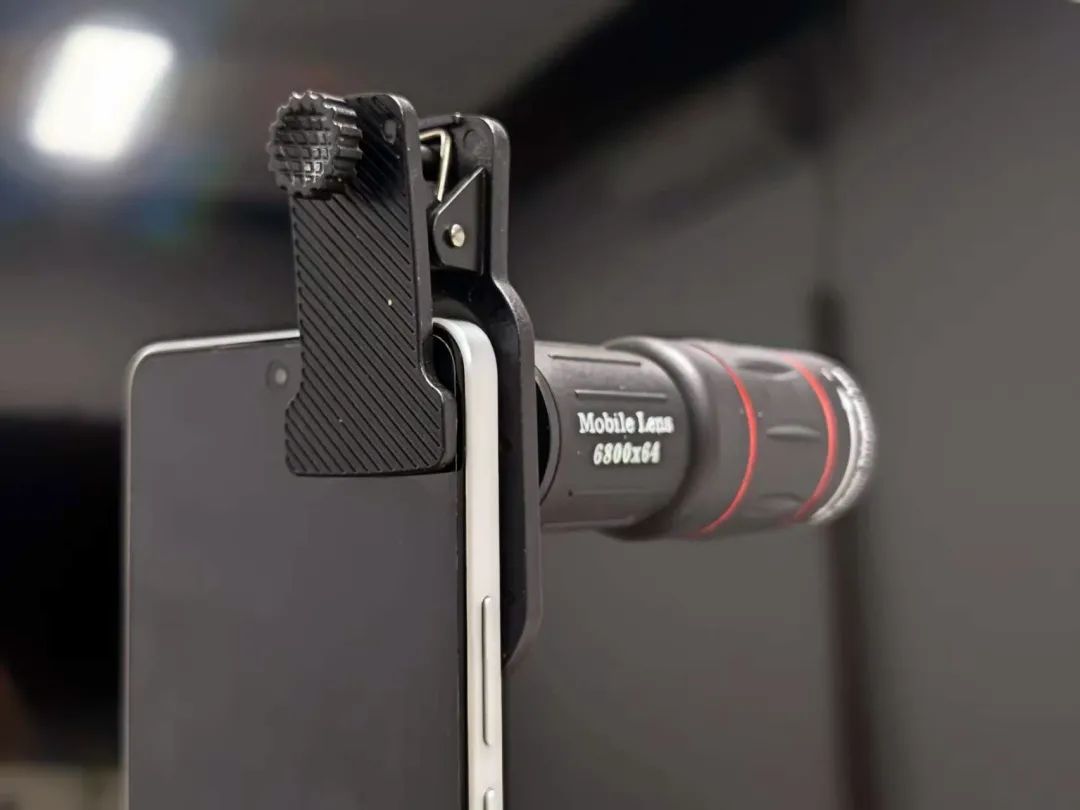 首先,你要把包装盒里面附带的这个架子,夹在你的相机模组上,确保开孔对准你想要的相机,然后把增倍镜直接拧上去。