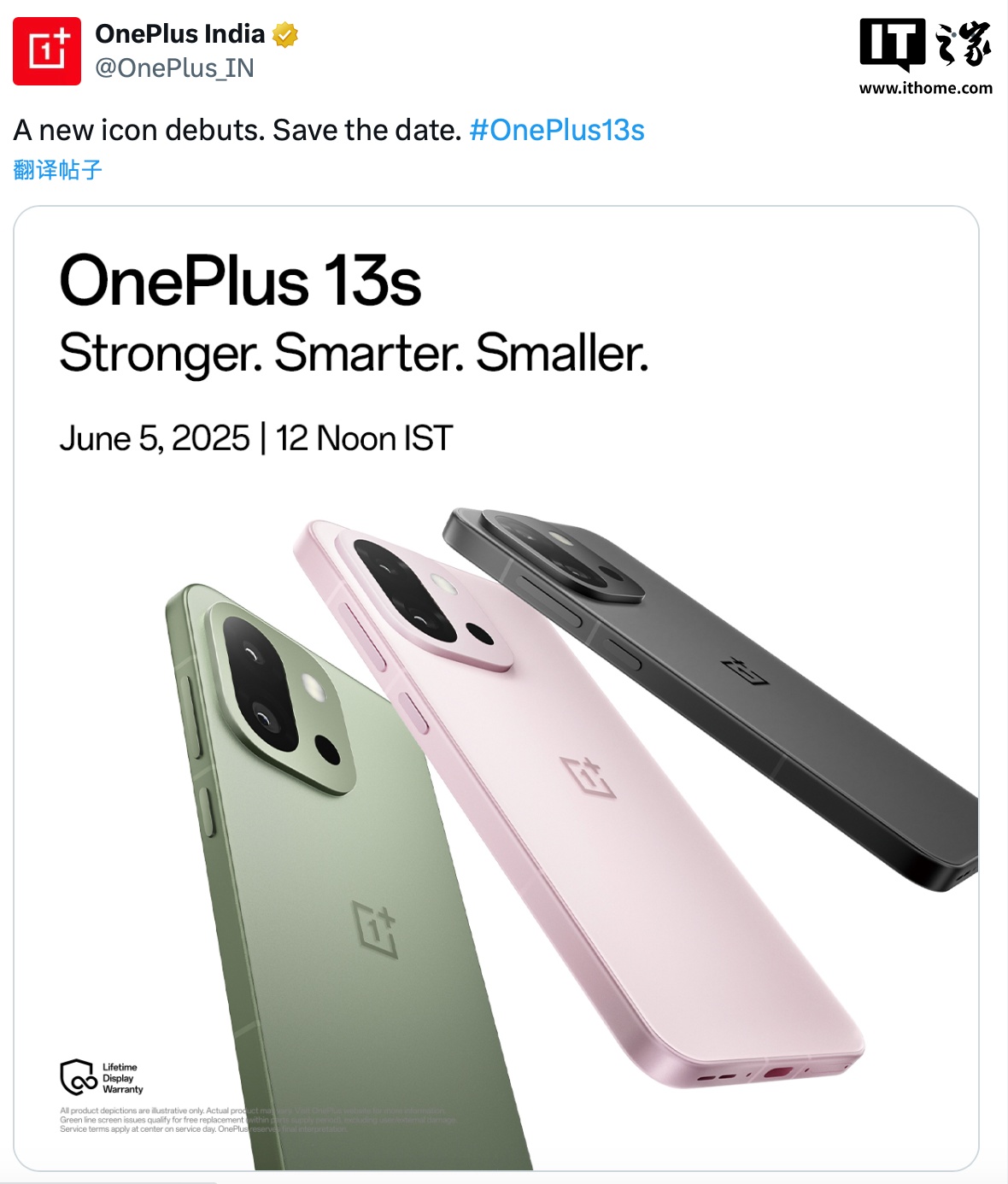 IT之家 5 月 19 日消息,一加印度今日于 X 平台上发文表示,一加 13T 海外版将更名为 13s,于 6 月 5 日发布。