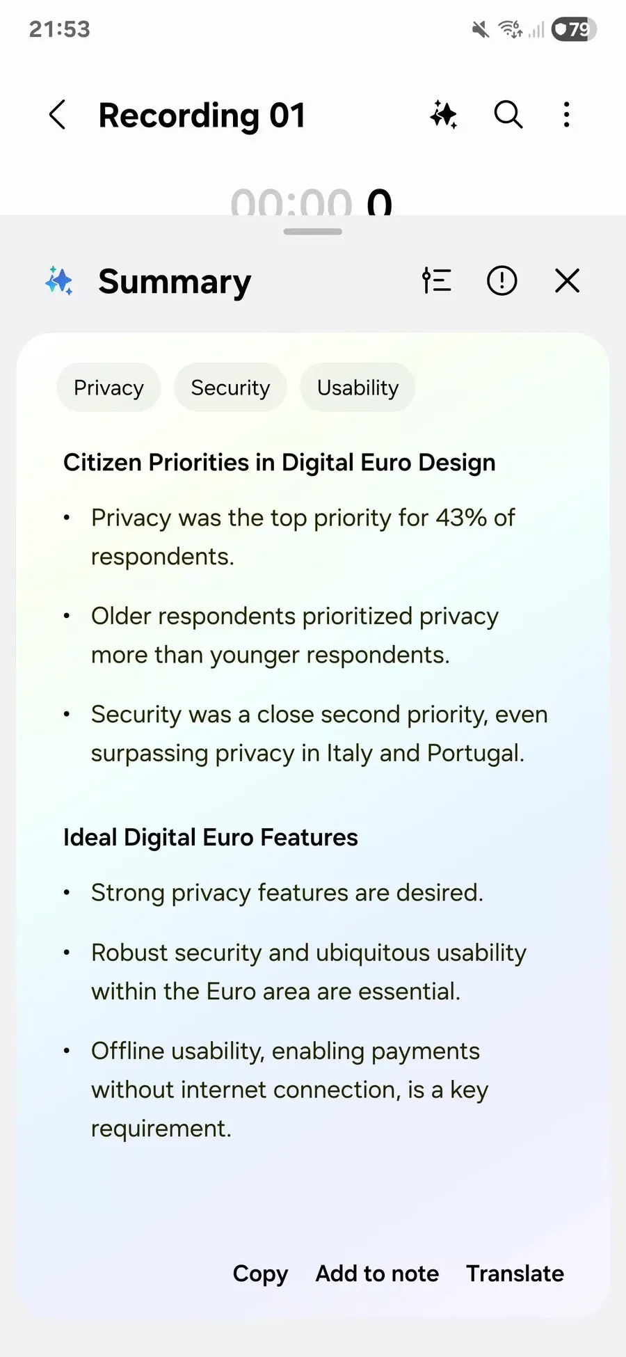 该媒体认为 One UI 8 新版 Voice Recorder 应用界面,表明三星转变了设计理念,AI 不再是主角,而是作为后台辅助工具存在,用户可以自主选择是否使用转录或翻译功能。