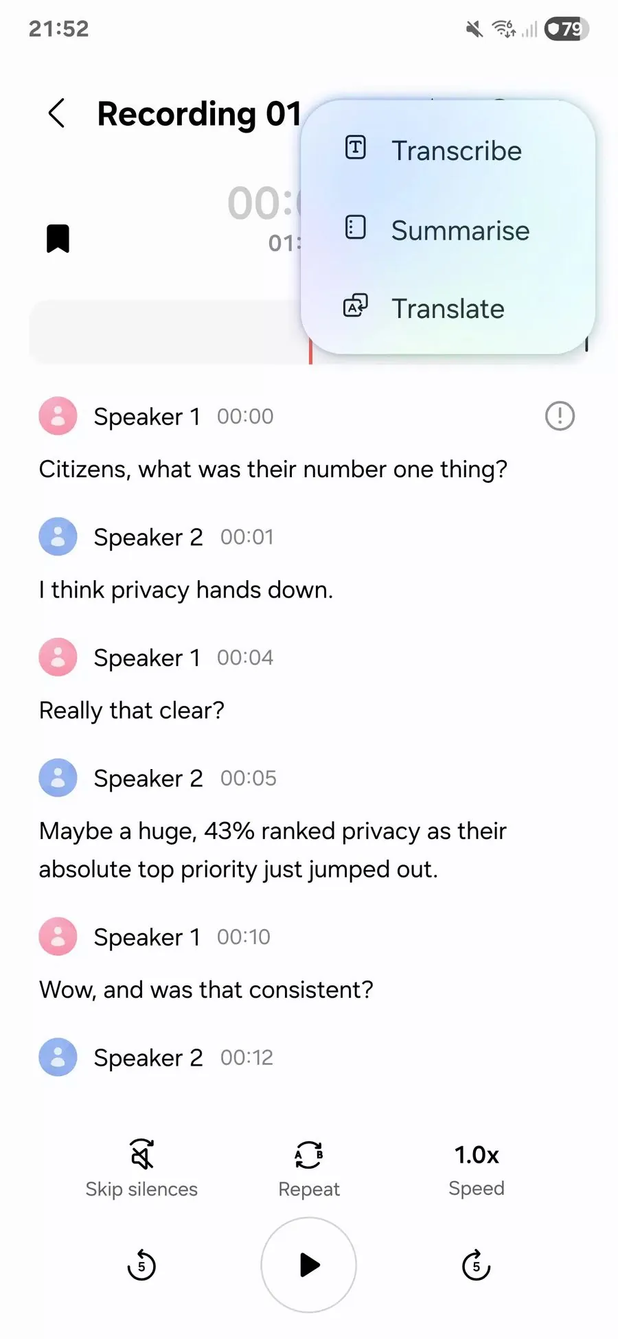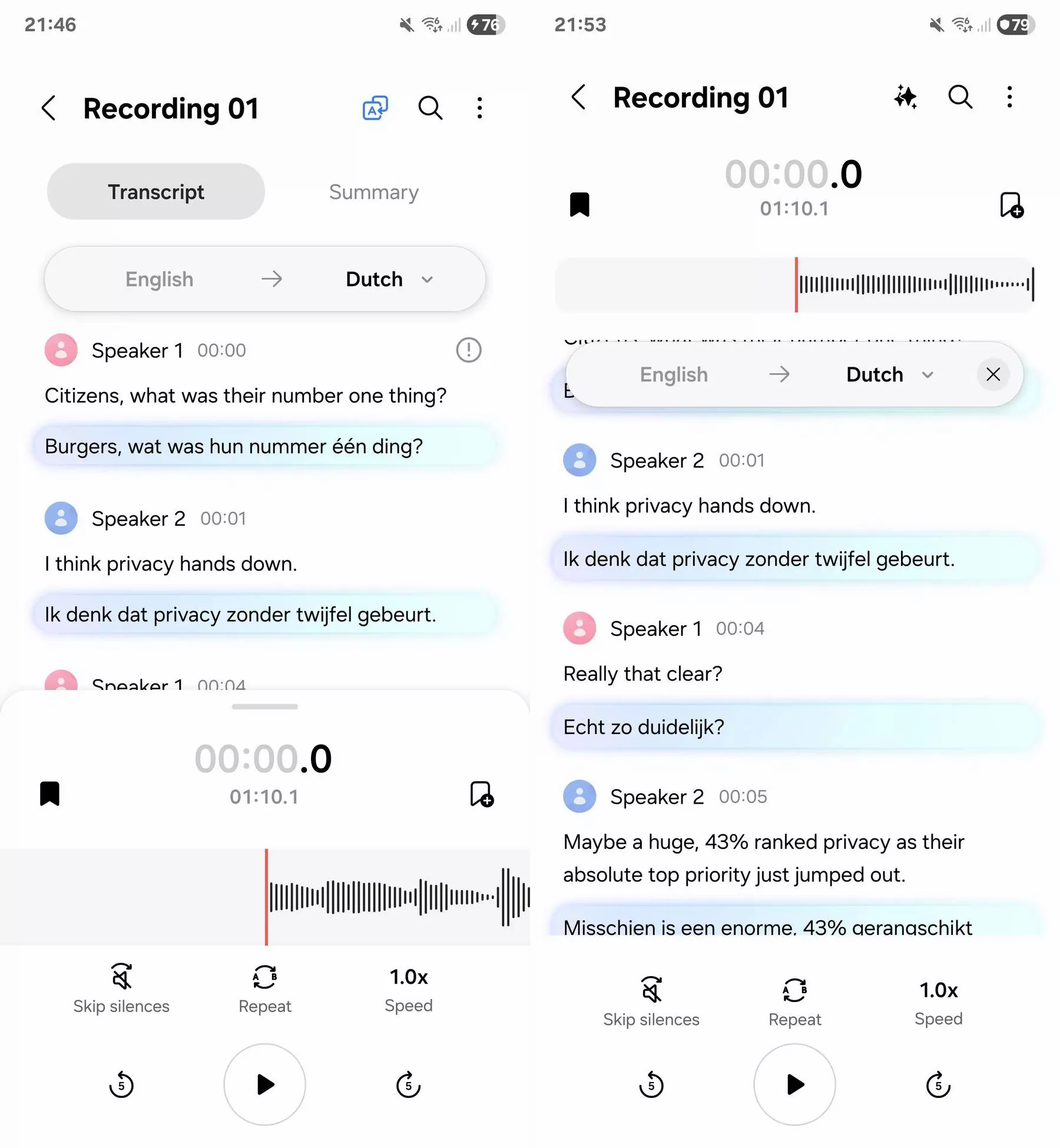 Voice Recorder 应用此前版本中,重点突出 AI 功能,转录和摘要按钮占据显眼位置,播放界面被挤到一边;而最新曝光的 One UI 8 版本中,播放功能重回屏幕中心,成为主要焦点,界面保留转录功能,但摘要和翻译等 AI 功能整合到屏幕顶部的菜单中。
