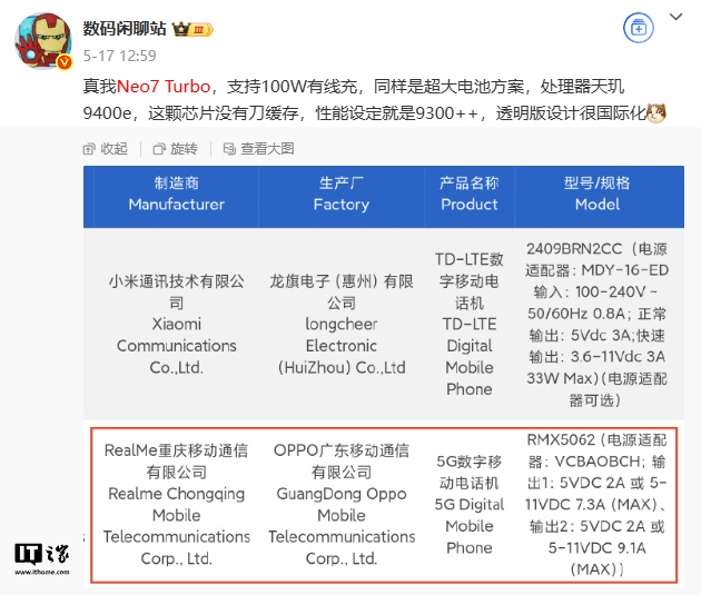 据IT之家此前报道,真我 realme 副总裁、全球营销总裁、中国区总裁徐起表示,真我 Neo7 Turbo 手机“超越同档的旗舰性能,前所未有的全新设计”。另有爆料称 realme 真我 Neo7 Turbo 将搭载天玑 9400e 处理器,支持 100W 有线充,同样是超大电池方案,透明版设计很“国际化”。