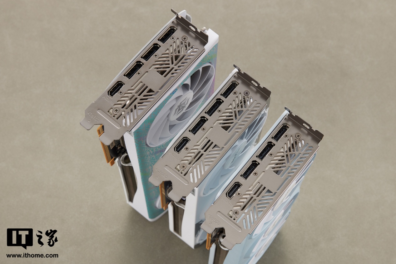 I/O 接口挡板部分三张显卡同样采用了一致的设计,连尺寸都完全一样。接口照例给到了 3*DP2.1b + 1*HDMI2.1b 的组合,最高支持 8K / 165Hz 视频输出。