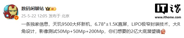 IT之家 5 月 22 日消息,博主 @数码闲聊站 今日曝光一款天玑 9500 大杯新机的部分规格,预计为 OPPO 旗下产品。
